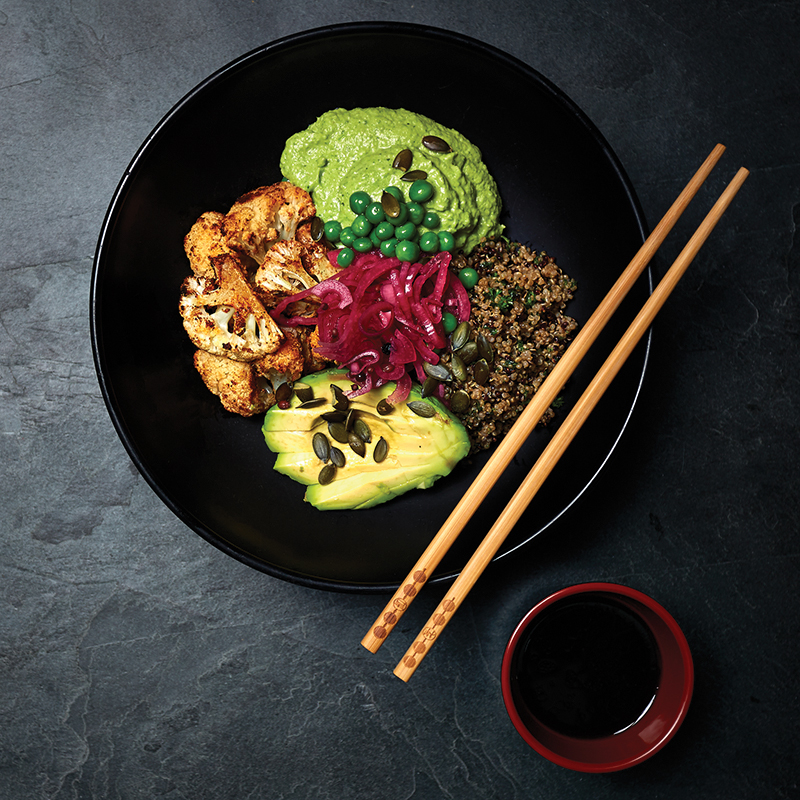 As we start a new week with good intentions, why not begin your celebration of the great British pea with a healthy Buddha Bowl with Chipotle Cauliflower, Pea Hummus and Quinoa. Did you know that a “Buddha Bowl,” as defined by urban dictionary, is “a bowl which is packed so full that it has a rounded ‘belly’ appearance on the top much like the belly of a buddha.” Sounds good enough for us!