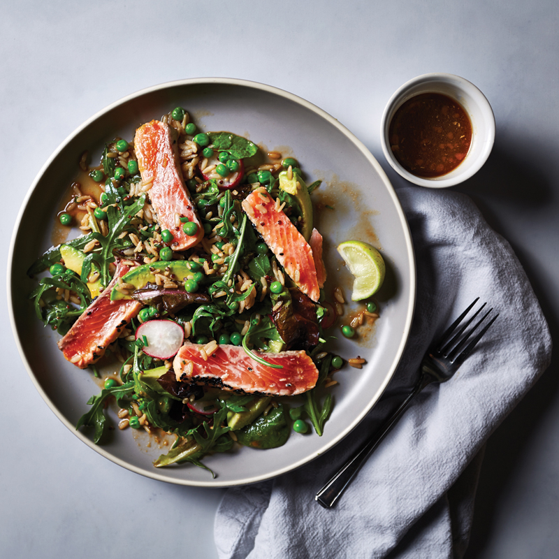If you are following this meal plan to a tee, you’ll be pleased to hear that today’s recipe recommendation is the Salmon Sashimi and Asian Pea Salad with Quinoa and Miso Dressing.